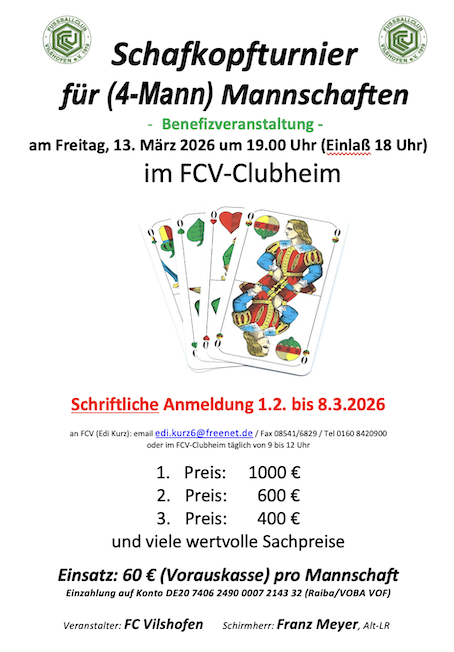 Zum Schluß wird das Ergebnis dieser 4 Spieler addiert und als Mannschaft gewertet. Die Anmeldung einer Mannschaft muß bis spätestens 08.03. schriftlich erfolgen als email an edi.kurz6@freenet.de oder per Fax an 08541/6829 oder per Post an FC Vilshofen, Kloster-Mondsee-Straße 7, 94474 Vilshofen an der Donau. Die Anmeldung muß den Namen der Mannschaft, die Namen der 4 Spieler und die Telefonnummer des Verantwortlichen enthalten. Gleichzeitig ist ist die Startgebühr (60 € für die Mannschaft) an FC Vilshofen DE20 7406 2490 0007 2143 32 bei der Raiba/VOBA Vilshofen als Vorauskasse zu überweisen. 01608420900 langes Blatt, mit Solo und Wenz Plus Minus Punkte