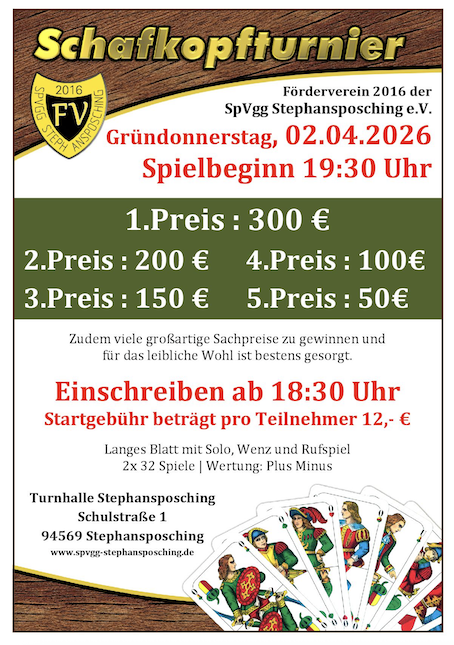 Ausrichtung in der Turnhalle Stephansposching - barrierefrei. Sven Wittenzellner - 0160/90580442 langes Blatt, mit Solo und Wenz Plus Minus Punkte Web: https://www.spvgg-stephansposching.de