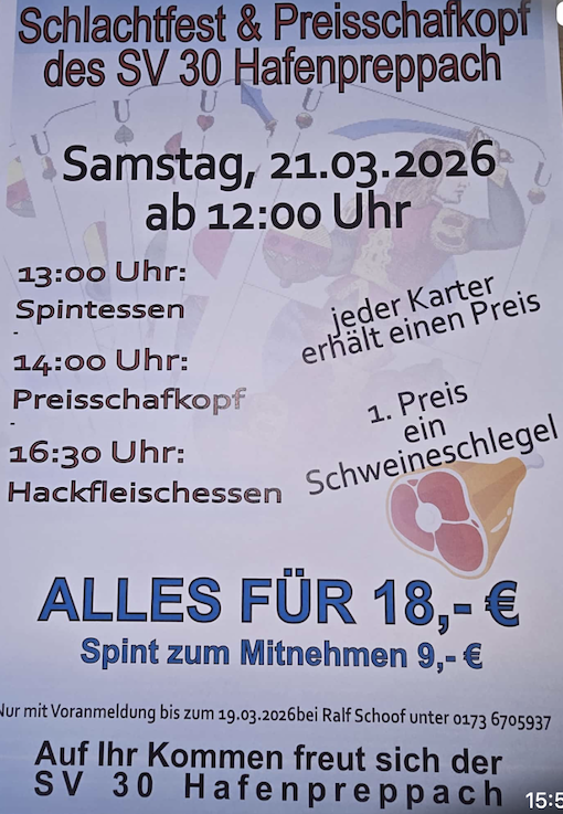 9. Preis: 30 Liter Hopf Weißbier • und weitere Wurst und Fleischpreise gespielt werden 2 x 32 Spiele, plus minus Punkte werden geschrieben,