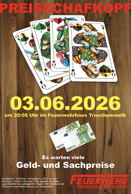 Eure Freiwillige Feuerwehr Troschenreuth. (bei Pegnitz) 0171-1732462 Hr. Michael Wolf (1. VS) kurzes Blatt, mit Solo, Wenz und Geier Plus Punkte Web: http://www.ff-troschenreuth.de