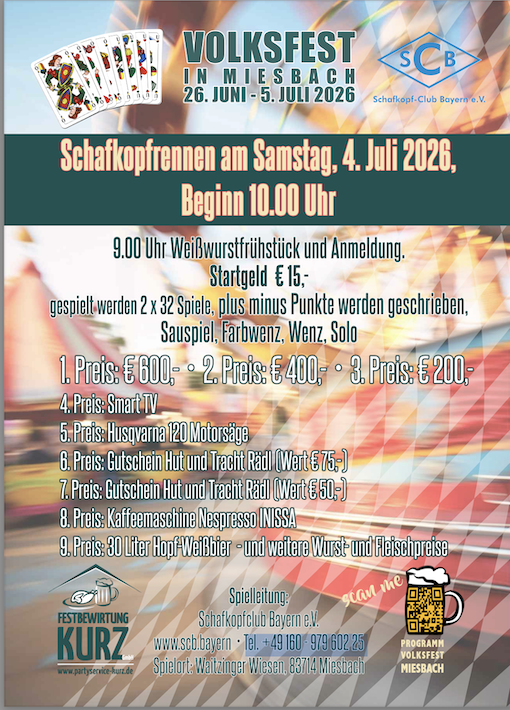 viele weitere wertvolle Sachpreise Gespielt wird bei uns der „Kurze Schafkopf“ mit „Einfachem Spiel“, „Wenz“ und „Solo“. Bitte beachten Sie bei der Preisverleihung, dass bei Punktgleichheit als nächstes Kriterium die Startnummer zählt. (niedrige Startnummer wird bevorzugt, bitte rechtzeitig erscheinen), d.h. es erfolgt keine Auswertung von gespielten „Wenz“ oder „Solo“. Tobias Köhl kurzes Blatt, mit Solo und Wenz Plus Minus Punkte