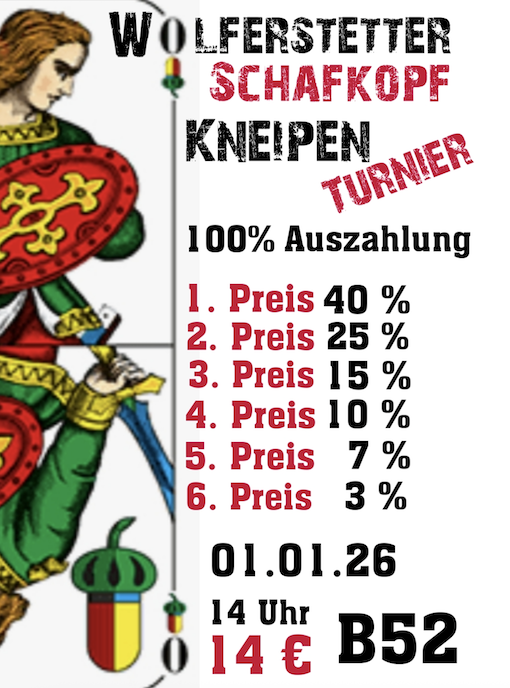 1. Preis 200.-€ 2. Preis 100.-€ 3. Preis 50.-€ weitere Brotzeiten und Sachpreise (je nach Tische) In der Spielpause erhält jeder Spieler eine Brotzeit( warm oder kalt). SPIELREGELN: Kurze Karte, Solo, Wenz, Sauspiel nur Pluspunkte Einschreibung ab 18:00 Tel. 01573 690 1196