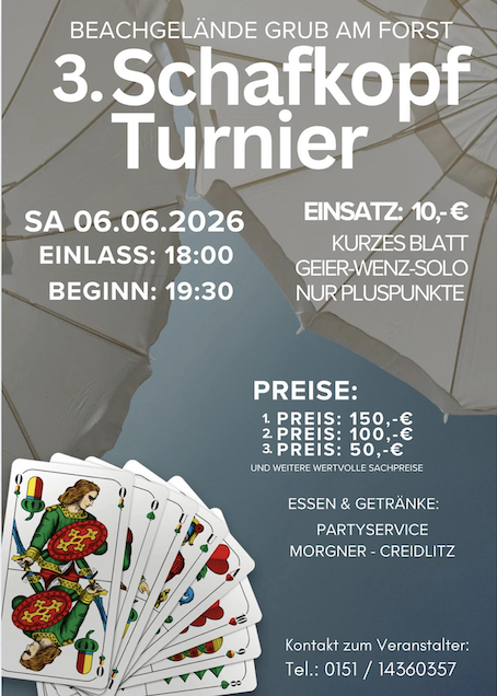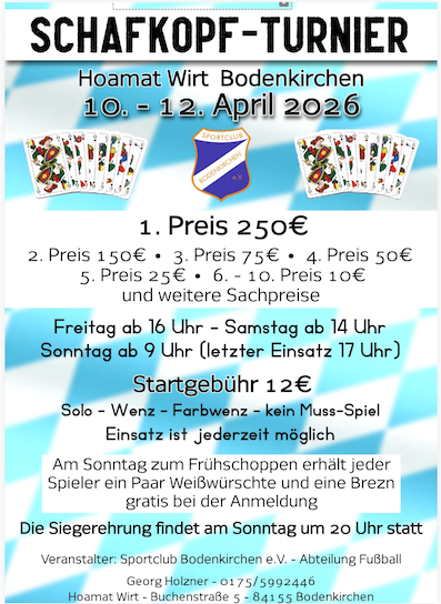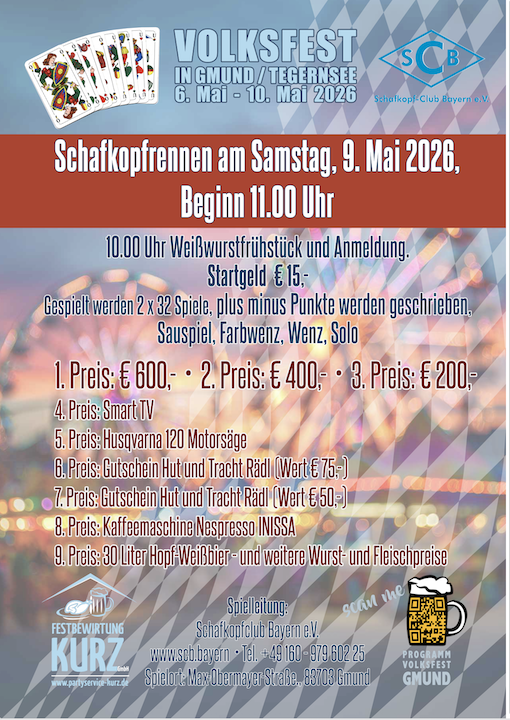 Voranmeldung (so lange Plätze frei sind): bis 01.04.2026 per Email: schafkopfrennen@msf-olching.de am 02.04.2026 ab 17 Uhr telefonisch: 08142 / 6539465 beschränkte Tischanzahl; Jeder Spieler erhält einen Preis;