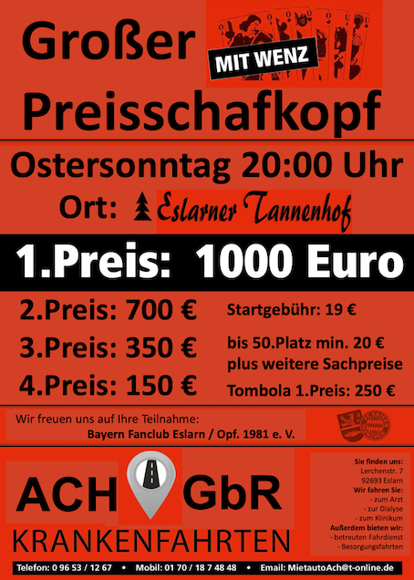 Auf Ihr Kommen freut sich der Bayernfanclub Eslarn. Marco Stöckl 0175/3611926 kurzes Blatt, mit Solo und Wenz Plus Punkte Web: http://www.bayernfanclub-eslarn.de